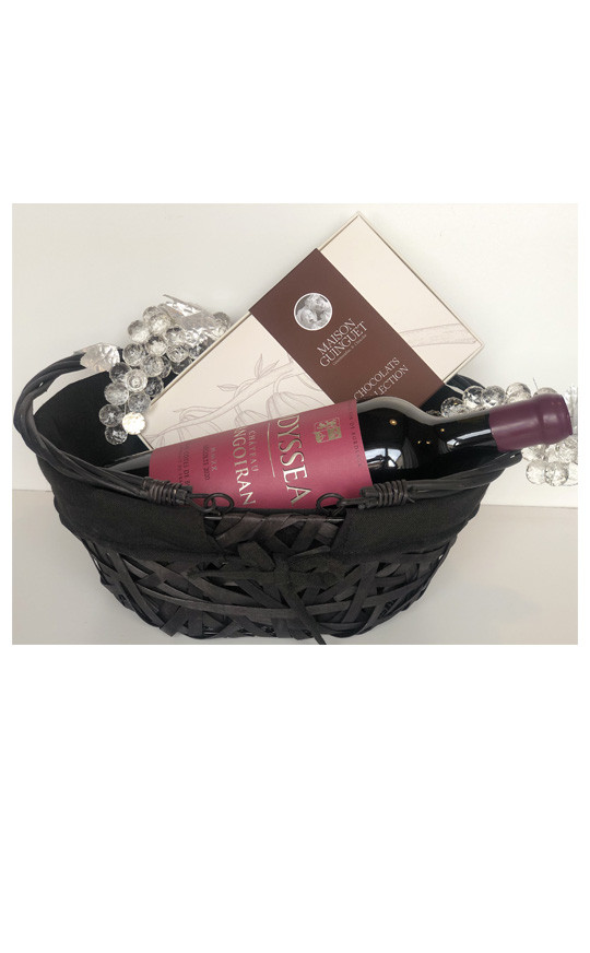 Corbeille luxe « Le Mariage Vin & Chocolat » en osier bois noir et tissu - dim. 35 x 25 x 15 cm contenant :