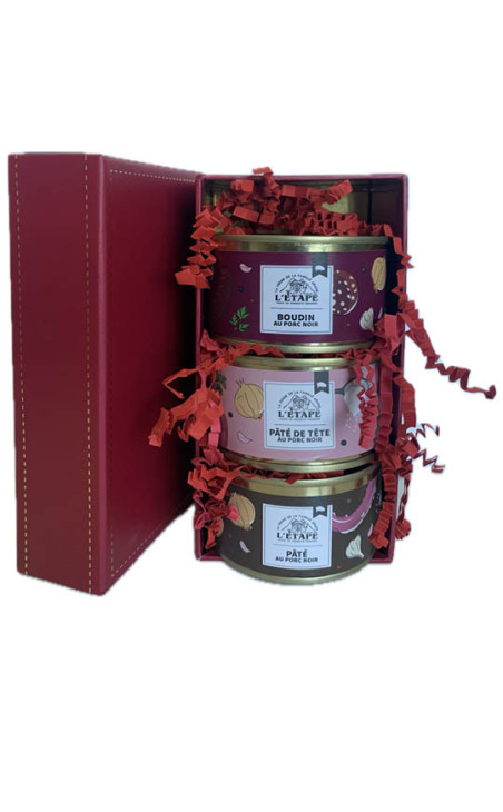 Ecrin luxe cadeau rouge avec surpiqûres (dim. 16x8x8 cm) comprenant un assortiment de 3 verrines 110g :