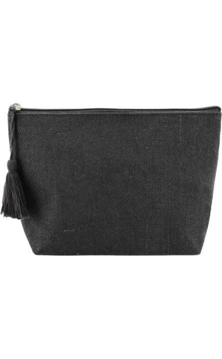 Sac pochette noir en toile de jute fermeture éclair finition pompon