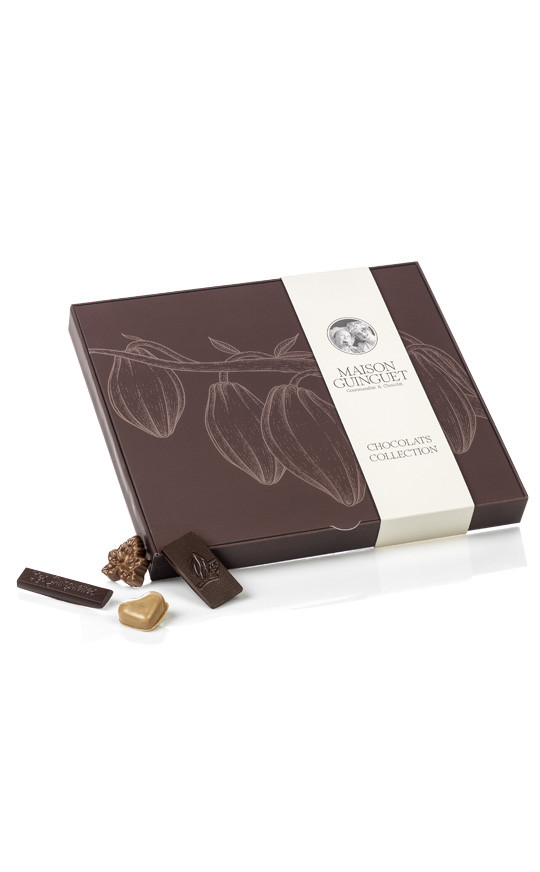 Coffret de chocolats fins : Guinguette framboise et caramel, rond passion, feuille noisette cacahuète, coeur blond cappuccino, p'tits beurre, resctangle cacao origine Vietnam, petites noisettes et petites amandes. 500g