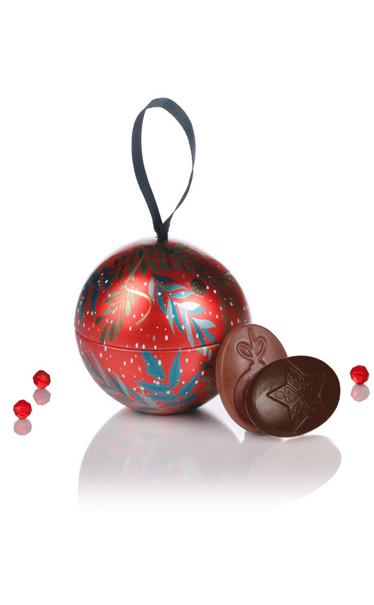 Boule de Noël décorative en métal (6 petits chocolats praliné noisette et caramel en sachets individuels) 48g